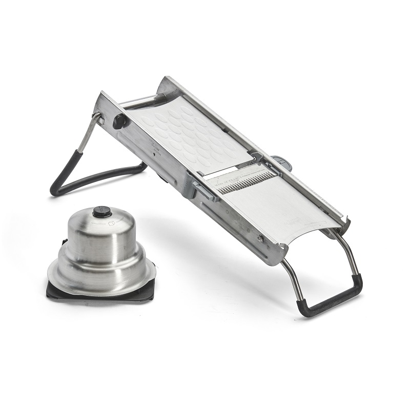 Мандолина De Buyer 2012.01 серии Revolution используется на предприятиях общественного питания, торговли и пищевых производствах для нарезки овощей, фруктов и других продуктов. Модель оснащена толкателем. Материал изделия - высококачественная нержавеющая сталь и полимерный материал.