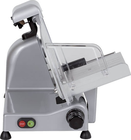 Профессиональный мотор с функцией принудительной вентиляции исключает возможность перегрева оборудования, а также делает его работу практически бесшумной. Слайсер оснащен фиксированным устройством для заточки ножа с двойным наждаком. Поддон для продуктов и перемычка для регулирования толщины среза выполнены из алюминия, отполированного путем анодирования, что обеспечивает их гигиеническую чистоту и защиту от коррозии.