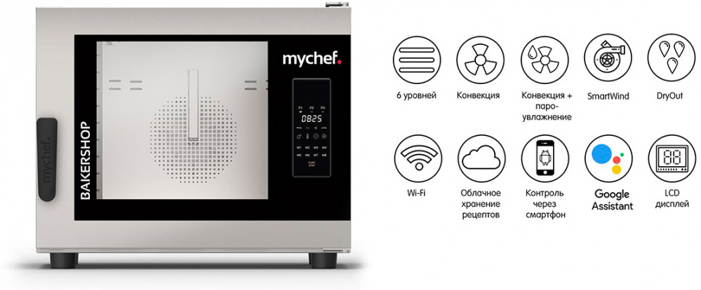 - Облачное хранение рецептов и параметров приготовления на базе сайта Mychef с возможностью подключения нескольких печей