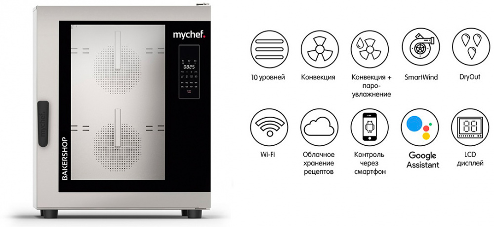 - Облачное хранение рецептов и параметров приготовления на базе сайта Mychef с возможностью подключения нескольких печей