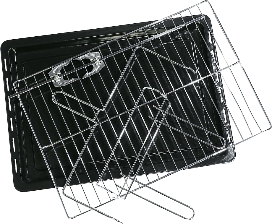 В поставку входит эмалированный противень с держателем, решетка, сливной поддон и вертел с держателем и 2 зажимами.