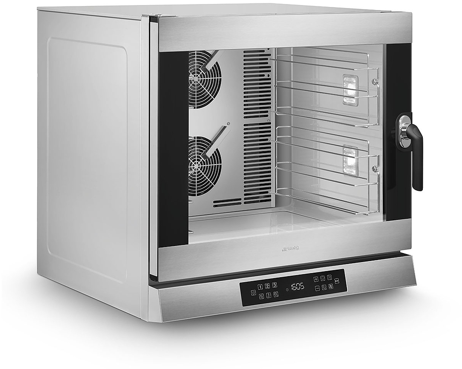Конвекционная печь Smeg ALFA 625 E1HDSR используется для выпечки хлебобулочных и кондитерских изделий и приготовления блюд на предприятиях общественного питания, торговли и пищевых производствах. Модель оснащена электронным управлением, ручным переключением термостата безопасности, автоотключением при открытой двери, таймером, принудительной вентиляцией и регулируемыми ножками. Материал корпуса и камеры - высококачественная нержавеющая сталь.
