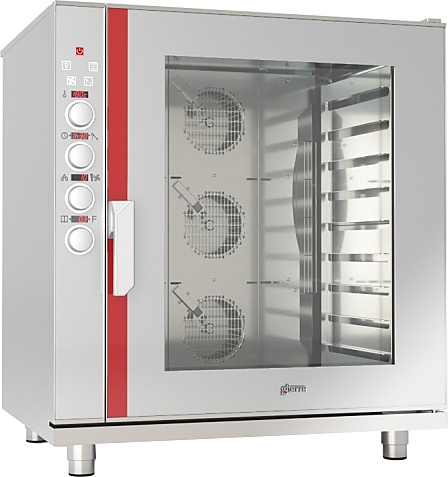 Устройство оснащено 3 реверсными вентиляторами с регулируемой скоростью. Печь полностью выполнена из нержавеющей стали AISI 430. Дверь оборудована силиконовым уплотнением и двойным закалённым стеклом, коорое может быть откинуто, что при необходимости позволяет легко осуществлять чистку оборудования изнутри и между стекол.
