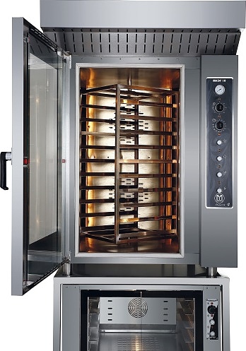 - Высокоэффективная система двигателей и вращающихся в противоположном направлении вентиляторов (производства ЕС) для равномерной конвекции и однородного выпекания продукта