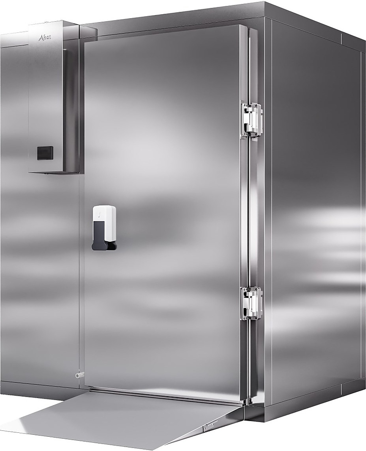 Камера шоковой заморозки Abat ШОКК-201 используется на предприятиях общественного питания, торговли и пищевых производствах для быстрой заморозки и хранения продуктов. Модель оснащена воздухоохладителем, 2 вентиляторами, навесной дверью, низкотемпературным уплотнителем, оттайкой горячим газом, подогревом и двухсторонним замком. Материал пандуса и пола камеры - рифленая нержавеющая сталь, материал стенок и потолка - сэндвич-панель из нержавеющей стали (толщина 80 мм).