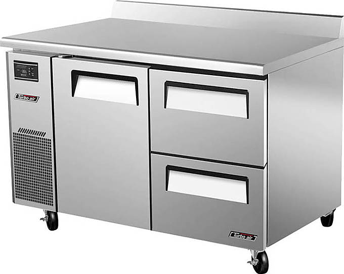 Холодильный стол Turbo air KWR12-2D-2 предназначен для раскатки теста, обработки, охлаждения и кратковременного хранения продуктов и напитков на предприятиях общественного питания и торговли. Корпус выполнен из нержавеющей стали (гальванизированная сталь на оборотной стороне и внизу) с применением пожаробезопасных стенок толщиной 60 мм, уплотнения - из АБС-пластика (акрилонитрилбутадиенстирола), не пропускающего конденсата, пол - из нержавеющей стали с алюминиевыми вставками по бокам и сзади оборудования, тройные направляющие - из высококачественной нержавеющей стали.