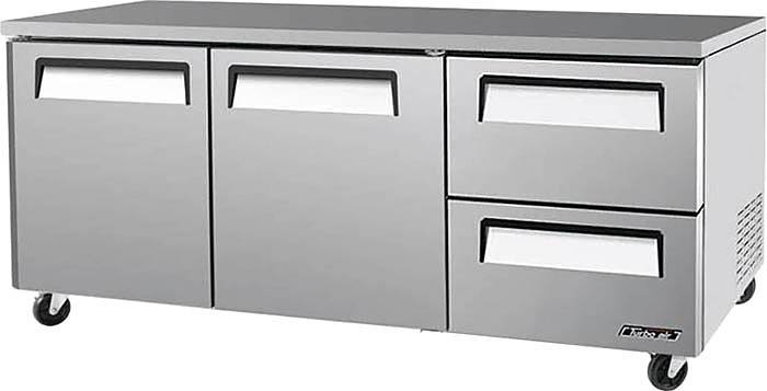 Холодильный стол Turbo air CMUR-72-2D-2 используется на предприятиях общественного питания, торговли и пищевых производствах для обработки, охлаждения и кратковременного хранения продуктов, а также для раскатки теста. Стол оснащен динамической системой охлаждения и аналоговым управлением. Материал корпуса - нержавеющая сталь (пожаробезопасные стенки 60 мм), материал пола - нержавеющая сталь с алюминиевыми вставками, материал направляющих - нержавеющая сталь, уплотнения выполнены из АБС-пластика.