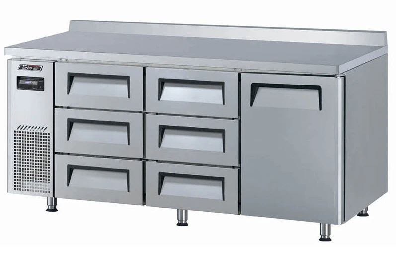 Холодильный стол Turbo air KWR18-3D-6-700 используется для охлаждения, заморозки и длительного хранения пищевых продуктов, а также для обработки ингредиентов на предприятиях общественного питания, торговли и пищевых производствах. Динамическая система охлаждения. Стол установлен на 6 колесах, оснащен дверью, полкой и 6 ящиками. Материал корпуса и направляющих - нержавеющая сталь, материал задней и нижней панелей - гальванизированная сталь, материал пола - нержавеющая сталь с алюминиевыми вставками, материал полок - толстая стальная проволока с виниловым покрытием, материал уплотнения - ABS-пластик.