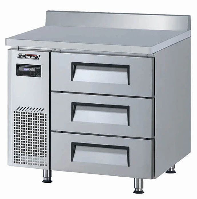 Холодильный стол Turbo air KWR9-3D-3-600 используется для охлаждения, заморозки и длительного хранения пищевых продуктов, а также для обработки ингредиентов на предприятиях общественного питания, торговли и пищевых производствах. Динамическая система охлаждения. Стол установлен на 6 колесах, оснащен 3 ящиками. Материал корпуса и направляющих - нержавеющая сталь, материал задней и нижней панелей - гальванизированная сталь, материал пола - нержавеющая сталь с алюминиевыми вставками, материал полок - толстая стальная проволока с виниловым покрытием, материал уплотнения - ABS-пластик.