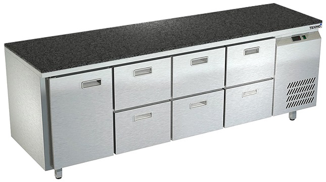 Холодильный стол Техно-ТТ СПБ/О-322/16-2206 предназначается для раскатки теста, обработки, охлаждения и кратковременного хранения продуктов и напитков на предприятиях общественного питания, торговли и пищевых производствах. Секции оснащены направляющими и ящиками с доводчиками. Материал корпуса - нержавеющая сталь AISI 430, материал столешницы - гранит (толщина 20 мм), материал задней панели и дна - оцинкованная сталь.