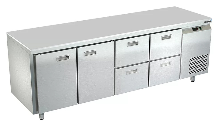 Холодильный стол Техно-ТТ СПБ/О-522/24-2206 предназначается для раскатки теста, обработки, охлаждения и кратковременного хранения продуктов и напитков на предприятиях общественного питания, торговли и пищевых производствах. Секции оснащены направляющими и ящиками с доводчиками. Материал корпуса - нержавеющая сталь AISI 430, материал столешницы - полипропилен (толщина 20 мм), материал задней панели и дна - оцинкованная сталь.