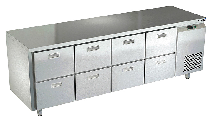 Холодильный стол Техно-ТТ СПБ/Т-123/08-2207 предназначается для раскатки теста, обработки продуктов и ингредиентов, заморозки и хранения продукции, а также для размещения теплового оборудования на предприятиях общественного питания, торговли и пищевых производствах. Двери оснащены доводчиками. Материал корпуса и столешницы - нержавеющая сталь AISI 430, материал дна и задней панели - оцинкованная сталь.