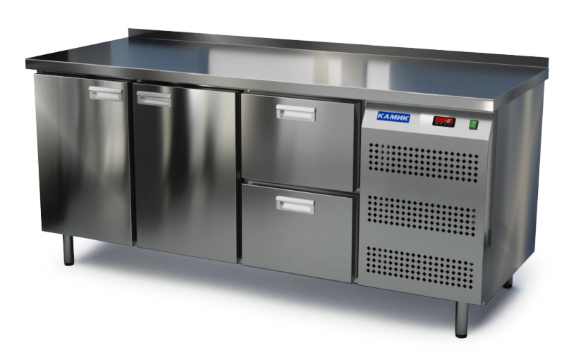 Холодильный стол КАМИК СО-221856 используется на предприятиях общественного питания и торговли для охлаждения и хранения продуктов, напитков и готовых блюд. Конструкция разделена на секции, каждая из которых оборудована сетчатой полкой и парой направляющих. Корпус выполнен из нержавеющей стали AISI 430 толщиной 1 мм, столешница - из нержавеющей стали AISI 304 толщиной 1,5 мм.