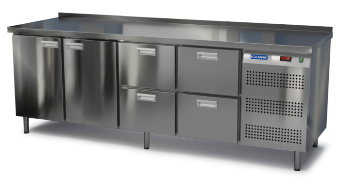 Холодильный стол КАМИК СО-24236 используется на предприятиях общественного питания и торговли для охлаждения и хранения продуктов, напитков и готовых блюд. Конструкция разделена на секции, каждая из которых оборудована сетчатой полкой и парой направляющих. Корпус выполнен из нержавеющей стали AISI 430 толщиной 1 мм, столешница - из нержавеющей стали AISI 304 толщиной 1,5 мм.