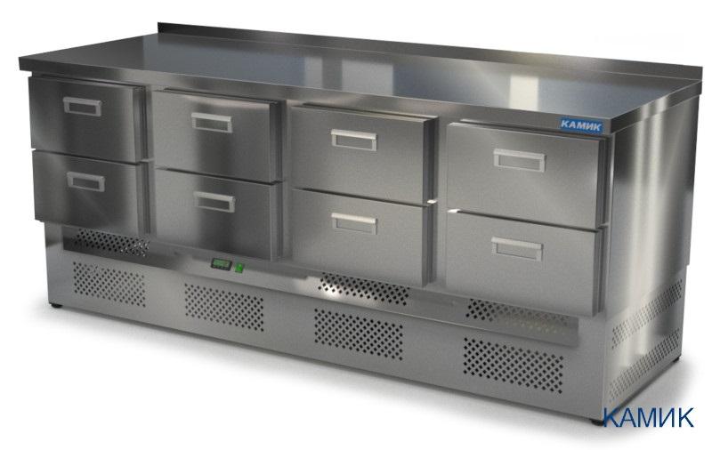 Холодильный стол КАМИК СО-08206Н используется на предприятиях общественного питания и торговли для охлаждения и хранения продуктов, напитков и готовых блюд. Конструкция разделена на секции, каждая из которых оборудована сетчатой полкой и парой направляющих. Корпус выполнен из нержавеющей стали AISI 430 толщиной 1 мм, столешница - из нержавеющей стали AISI 304 толщиной 1,5 мм.