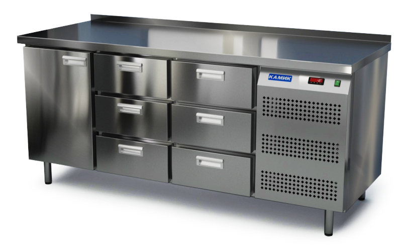 Холодильный стол КАМИК СО-16238 используется на предприятиях общественного питания и торговли для охлаждения и хранения продуктов, напитков и готовых блюд. Конструкция разделена на секции, каждая из которых оборудована сетчатой полкой и парой направляющих. Корпус выполнен из нержавеющей стали AISI 430 толщиной 1 мм, столешница - из нержавеющей стали AISI 304 толщиной 1,5 мм.