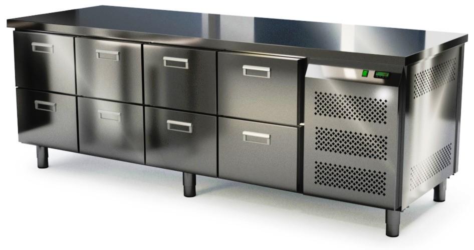 Холодильный стол КАМИК СО-08237 используется на предприятиях общественного питания и торговли для охлаждения и хранения продуктов, напитков и готовых блюд. Конструкция разделена на секции, каждая из которых оборудована сетчатой полкой и парой направляющих. Корпус выполнен из нержавеющей стали AISI 430 толщиной 1 мм, столешница - из нержавеющей стали AISI 304 толщиной 1,5 мм.