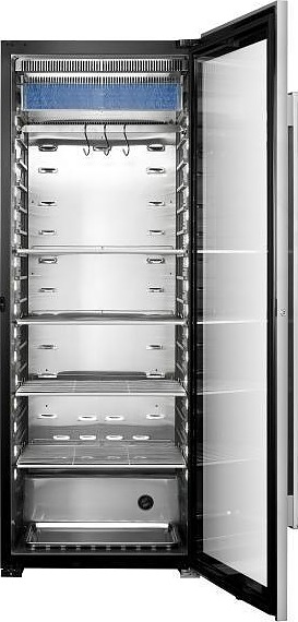 Шкаф для мяса MeatAge VI200 WT используется для охлаждения, хранения и вызревания мяса, ветчины и салями на предприятиях общественного питания, торговли, пищевых производствах и в домашних условиях. Модель оснащена регулировкой температуры и влажности, автоматической разморозкой, системой испарения конденсата, тачпадом со светодиодной подсветкой, оптической и акустической сигнализацией, регулируемыми полками, механическим замком и резервуаром для воды. Материал корпуса - окрашенный металл, материал боковых внутренних стенок - ABS-пластик, материал полок, задней стенки и комплектующих - высококачественная нержавеющая сталь, материал двери - ударопрочное закаленное стекло.