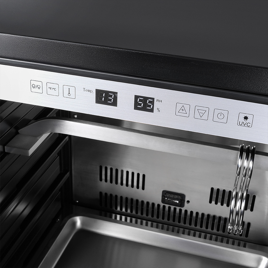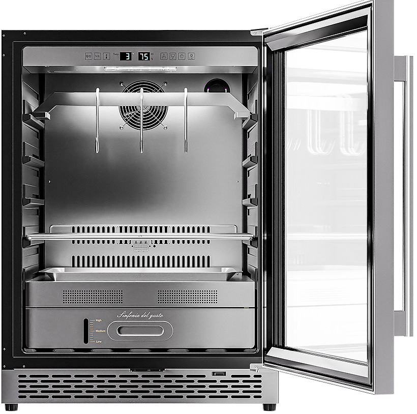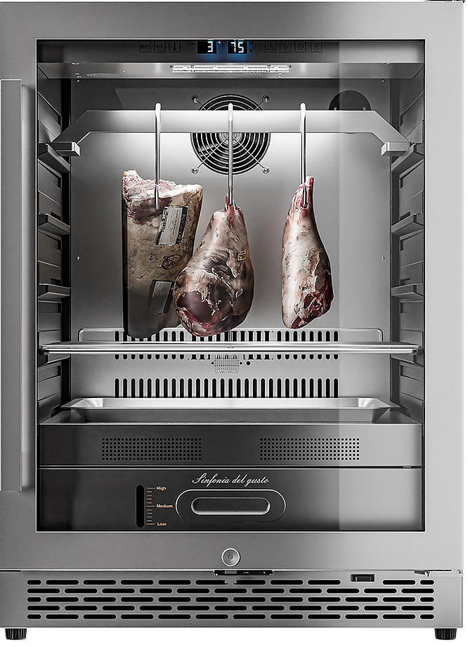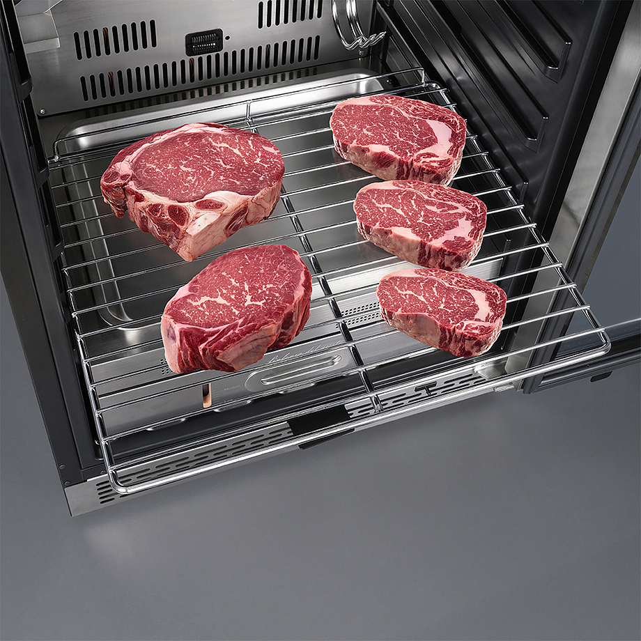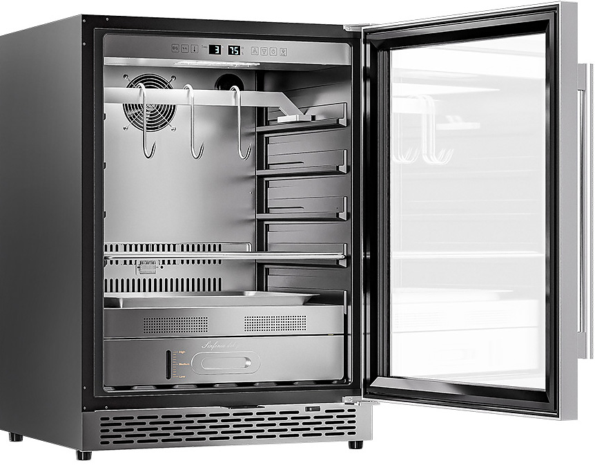 Шкаф Meyvel MM-45SR используется для охлаждения, хранения и вызревания мяса, птицы, колбасы, рыбы, ветчины, сыра и салями на предприятиях общественного питания, торговли, пищевых производствах и в домашних условиях. Модель оснащена сенсорным управлением, угольным фильтром, подсветкой, демонстрационным освещением, выдвижными полками, удобной ручкой, замком, поддоном для гималайской соли и регулируемыми по высоте ножками. Материал корпуса и ручки - сталь, материал рамки двери - бесшовная нержавеющая сталь, материал двери - тройное стекло с УФ фильтром, материал полок-решеток - хромированный металл.