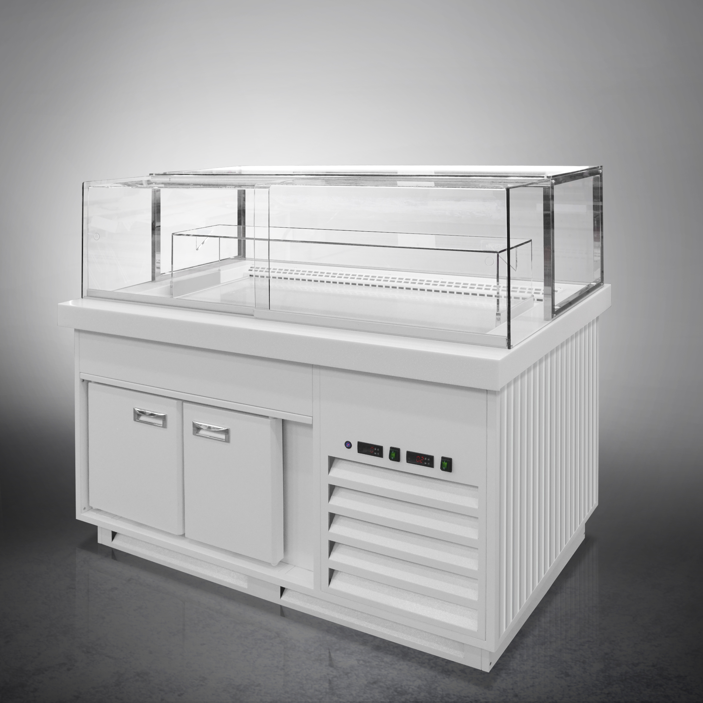 Витрина кондитерская Finist Maria Ms-19-9 используется для демонстрационной выкладки, охлаждения и хранения кондитерских и хлебобулочных изделий на предприятиях общественного питания и торговли. Модель оснащена микропроцессорным блоком, автоматической оттайкой, выдвижной полкой, подсветкой и дверьми-купе. Материал фронтальных и боковых панелей облицовки - МДФ панели, материал купола и полок - просветленное стекло, материал зоны выкладки и столешницы - искусственный камень.