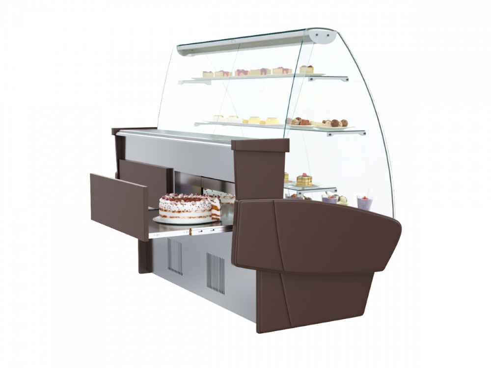Кондитерская витрина Carboma K95 SM 1,2-1 (ВХСд-1,2) используется на предприятиях общественного питания и торговли для демонстрации, охлаждения и кратковременного хранения тортов, пирожных и других кондитерских изделий. Модель оснащена гнутым передним стеклом, 3 полками, выдвижными поддонами и регулируемыми ножками высотой от 20 до 35 м. Корпус выполнен из стали с ППУ-изоляцией, зона выкладки и столешница - из нержавеющей стали, раздвижные задние створки - из оргстекла.
