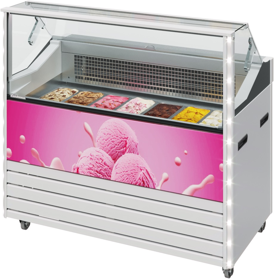 Витрина для мороженого Carboma IC72 SL 1,3-1 9003 предназначается для предпродажной демонстрации, охлаждения и хранения мороженого. Модель оснащена системой автоматической разморозки, технологией одноконтурной морозильной цепи из 2 элементов и технологией нагрева фронтального стеклопакета, позволяющей избегать запотевание стекла. Встроенные ручки, поворотно-откидная створка и колесики для перемещения. Материал столешницы - нержавеющая сталь, материал передней панели - крашеная сталь, створка из плексигласа, теплоизоляция корпуса - пенополиуретан.