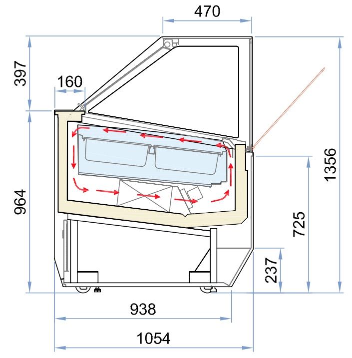 Каркас витрины изготовлен из углеродистой стали, окрашенной порошковой краской, дно зоны выкладки - из полированной нержавеющей стали, задняя панель - из пластифицированной стали, передняя панель - из окрашенной стали, полка - из алюминия, анодированного серебром. Цельный корпус имеет изоляцию из пенополиуретана, вспененного углекислотой, без использования озоноразрушающих веществ.