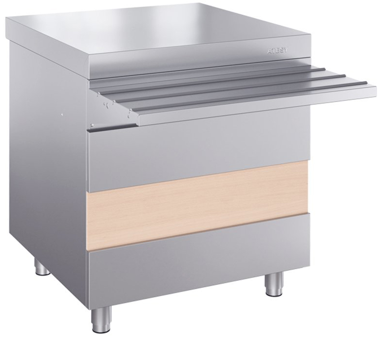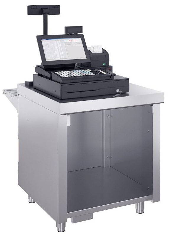 Кассовый стол ATESY Ривьера КСУ-700-02 используется на предприятиях общественного питания и торговли для оборудования рабочего места продавца-кассира. Модель оснащена розеткой для подключения кассового аппарата, расположенной со стороны обслуживающего персонала. Корпус и направляющая для подносов выполнены из нержавеющей стали AISI 430, столешница - из нержавеющей стали и усилена листом ламинированной ДСП толщиной 16 мм, ножки - из нержавеющей стали с пластиковой опорной частью.