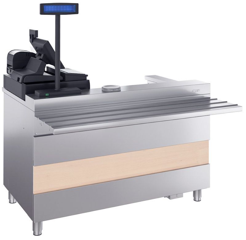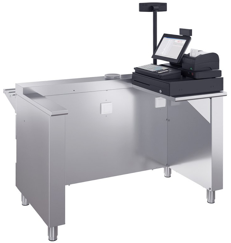 Кассовый стол ATESY Ривьера КСП-1200-02 используется на предприятиях общественного питания и торговли для оборудования рабочего места продавца-кассира. Модель оснащена розеткой для подключения кассового аппарата, расположенной со стороны обслуживающего персонала. Корпус и направляющая для подносов выполнены из нержавеющей стали AISI 430, столешница - из нержавеющей стали и усилена листом ламинированной ДСП толщиной 16 мм, ножки - из нержавеющей стали с пластиковой опорной частью.