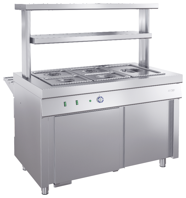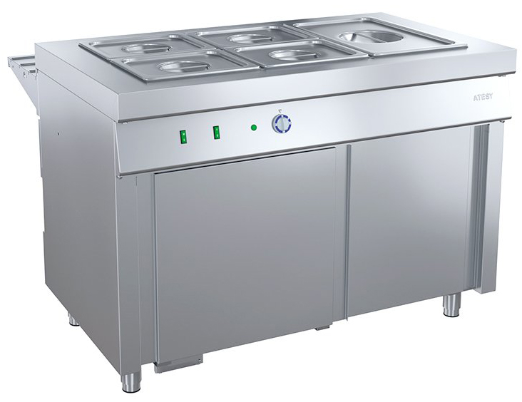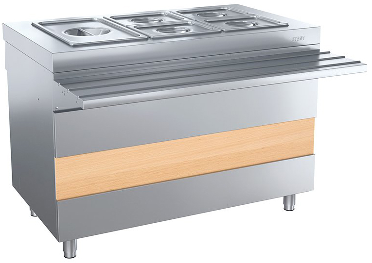 Мармит ATESY Ривьера М2-1200-02-СО используется на предприятиях общественного питания и торговли для поддержания в горячем состоянии гастроемкостей со вторыми блюдами, гарнирами и соусами. Модель оснащена герметичной ванной для размещения гастроемкостей и терморегулятором, позволяющим осуществлять настройку температуры нагрева гастроемкостей. Столешница выполнена из нержавеющей стали AISI 430 и усилена листом ламинированной ДСП толщиной 16 мм, ванна - из нержавеющей стали, ножки - из нержавеющей стали и пластиковой опорной части.