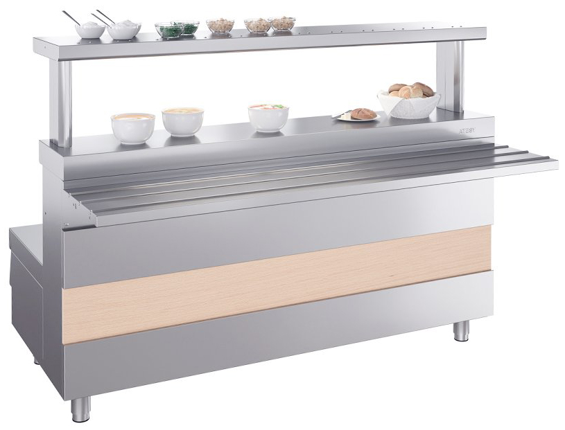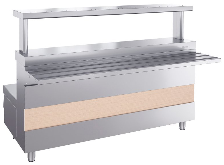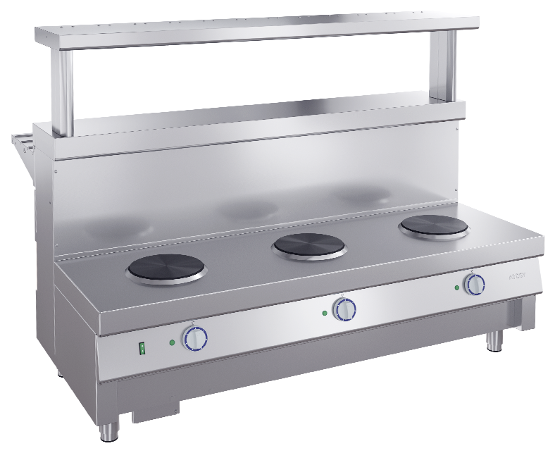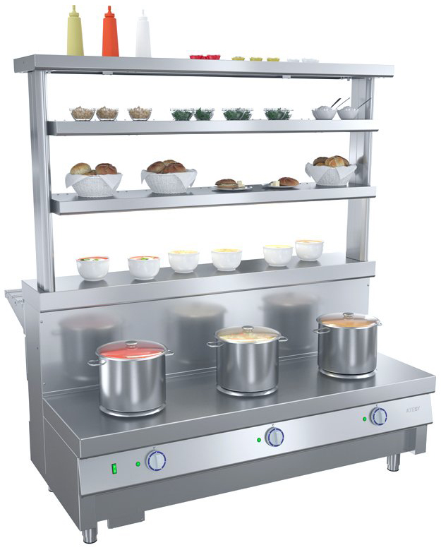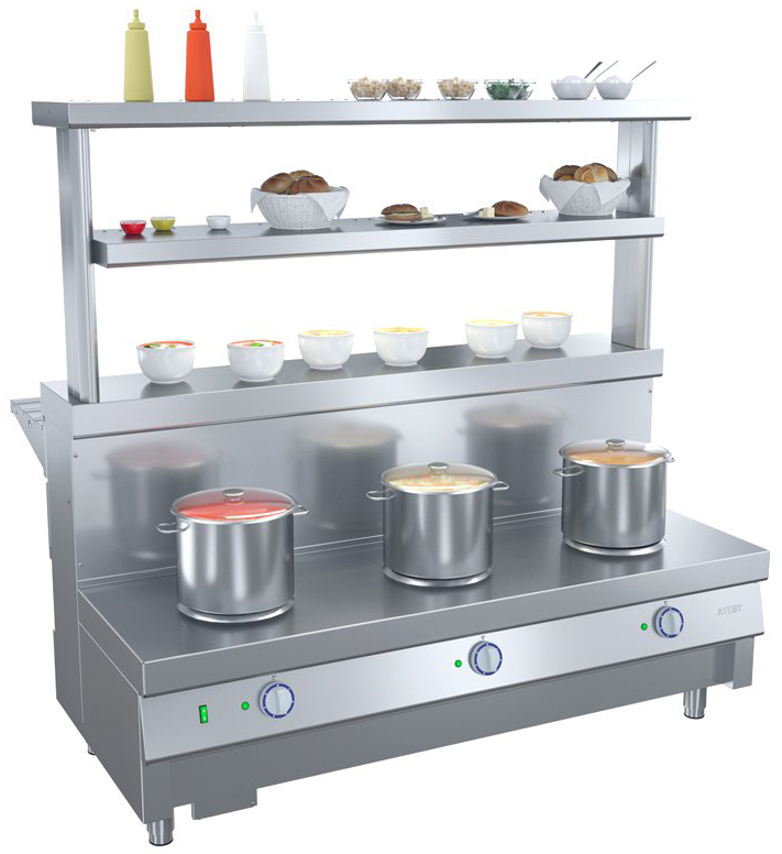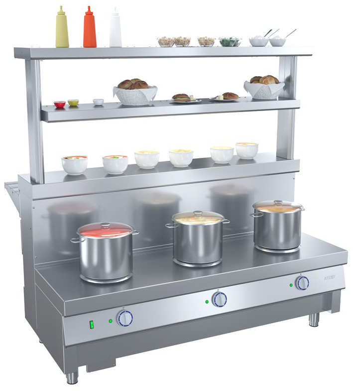 Мармит ATESY Ривьера М1-3.1500-02-О используется на предприятиях общественного питания и торговли для поддержания в горячем состоянии наплитной посуды с первыми блюдами. Модель оснащена 3 круглыми конфорками и 3 6-позиционными пакетными переключателями, позволяющими регулировать их температуру. Столешница выполнена из нержавеющей стали AISI 430 и усилена листом ламинированной ДСП толщиной 16 мм, ножки - из нержавеющей стали и пластиковой опорной части.