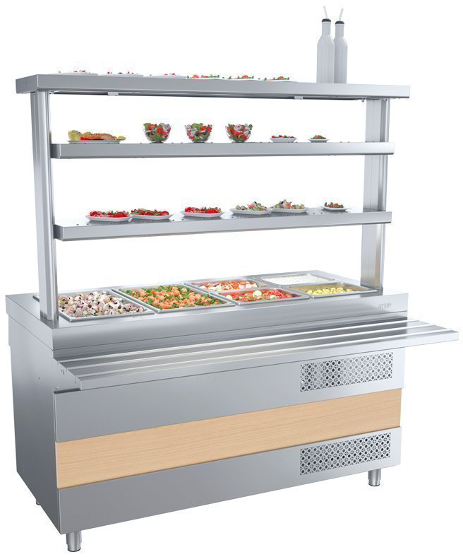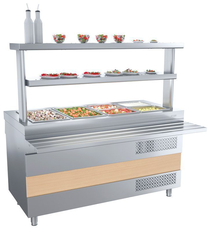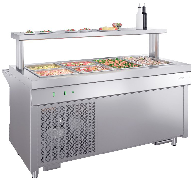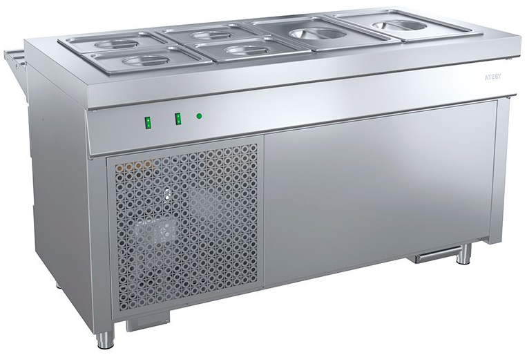 Охлаждаемый стол ATESY Ривьера ОС-1500-02-О используется на предприятиях общественного питания и торговли для кратковременного хранения и раздачи холодных напитков, салатов, кисломолочных продуктов и других блюд, требующих хранения в охлажденном состоянии. Модель оснащена герметичной ванной для размещения гастроемкостей или напитков и продуктов в фабричной упаковке, а также тарелок с уже сервированными блюдами непосредственно на дне ванны. Столешница выполнена из нержавеющей стали AISI 430 и усилена листом ламинированной ДСП толщиной 16 мм, ванна - из нержавеющей стали, ножки - из нержавеющей стали и пластиковой опорной части.