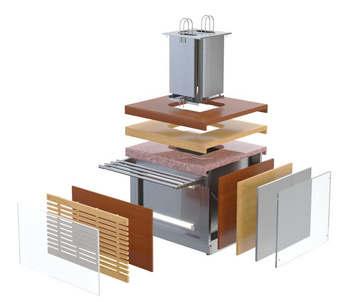 Панели из натурального дерева, матового стекла, нержавеющей стали, скинали и т.д.