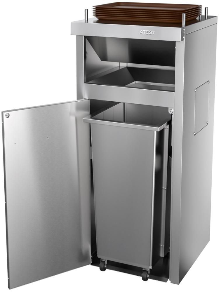 ATESY ССО-240-С-01 используется на предприятиях общественного питания, торговли для утилизации пищевых остатков, одноразовой посуды и различной картонной упаковки. В модели предусмотрена полка для подносов и внутренний мусороприемник на колесах. Тумба и емкость - шлифованная легированная стал.