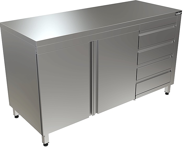 Стол производственный Кобор СТ/1-150/60/Р используется на предприятиях общественного питания, торговли и пищевых производствах для хранения кухонной утвари и обработки различных ингредиентов перед приготовлением. Материал каркаса - высококачественная нержавеющая сталь (труба 40х40 мм), материал столешницы - высококачественная нержавеющая сталь AISI 430, усиленная листом ЛДСП (толщина 16 мм).