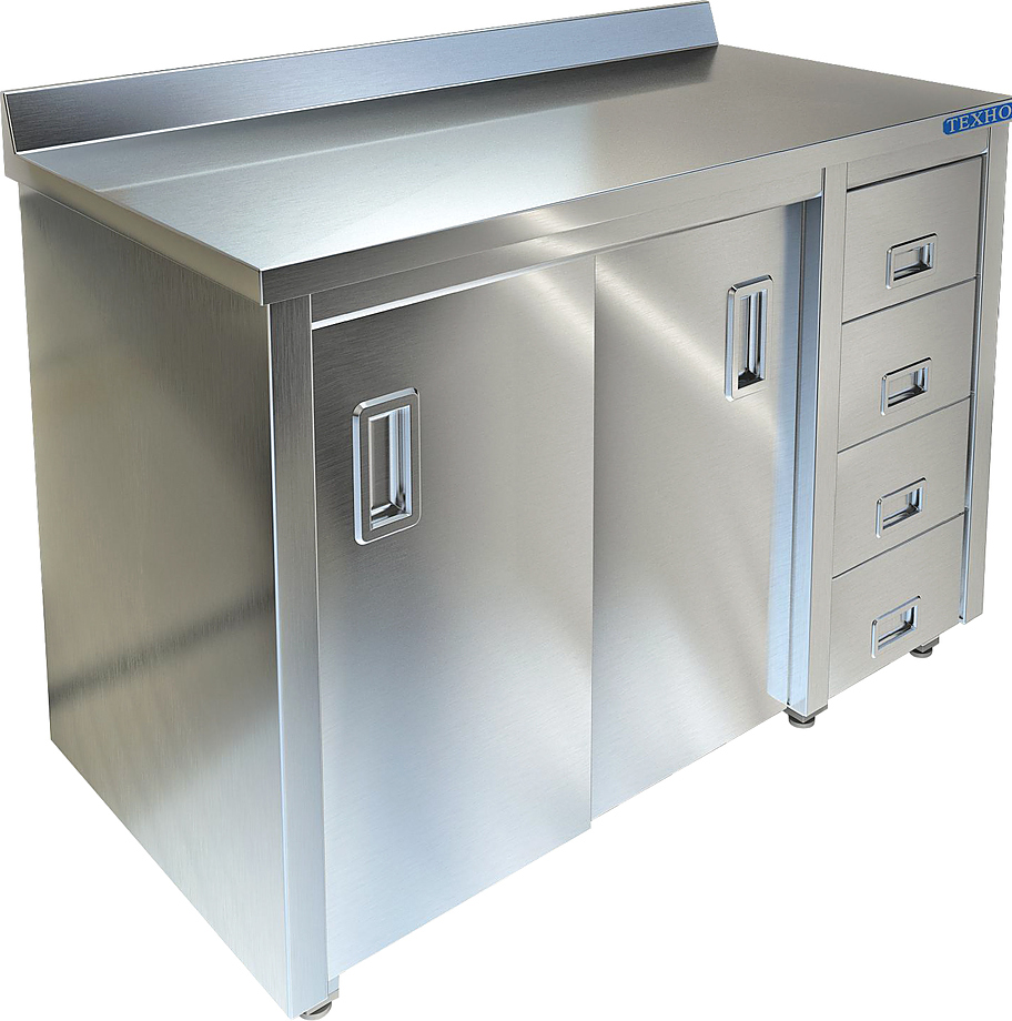 Производственный стол Техно-ТТ СПС-936/1700-П предназначен для разделки и обработки пищевых продуктов, а также для расстановки и хранения посуды и кухонного инвентаря на предприятиях общественного питания, торговли и пищевых производствах. Стол оснащен 4 выдвижными ящиками, 1 сплошной полкой, 3 дверями-купе и регулируемыми по высоте ножками для компенсации неровностей пола. Материал сварного корпуса и столешницы - нержавеющая сталь AISI 430, материал задней стенки - оцинкованная сталь.