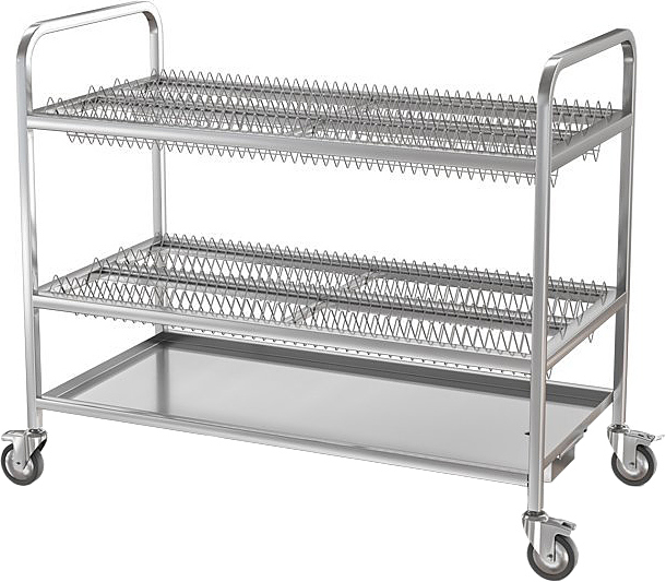 Тележка ATESY ТТ-Л-2-1200.600-02 серии Люкс используется на предприятиях общественного питания и торговли для временного хранения, транспортировки и естественной сушки тарелок, блюдец и другой посуды. Модель оснащена съемными кассетами для сушки тарелок. Полки и поддон выполнены из нержавеющей стали AISI 304, кассеты - из нержавеющего прутка AISI 304, рамы - из нержавеющей трубы AISI 304 сечением 25х25 мм.