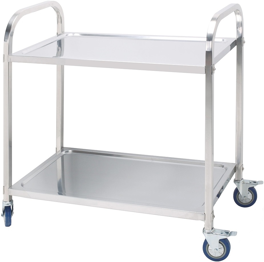 Сервировочная тележка Hurakan HKN-TS2 предназначается для перемещения и подачи готовых блюд, напитков, посуды и грязной посуды на мойку или кухонное помещение на предприятиях общественного питания, торговли и пищевых производствах. Модель оборудована 2 полками и 4 поворотными колесами, 2 из которых оборудованы тормозами. Материал - нержавеющая сталь.
