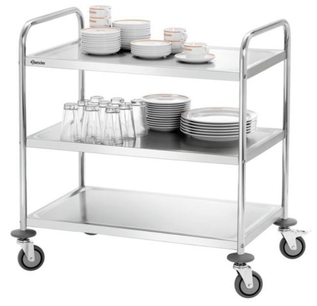 Тележка Bartscher TS301 используется на предприятиях общественного питания, торговли и пищевых производствах для сбора грязной посуды. Модель оснащена колесами, 2 из них с тормозами. Материал изделия - хромникелевая сталь (труба 25.8 мм).
