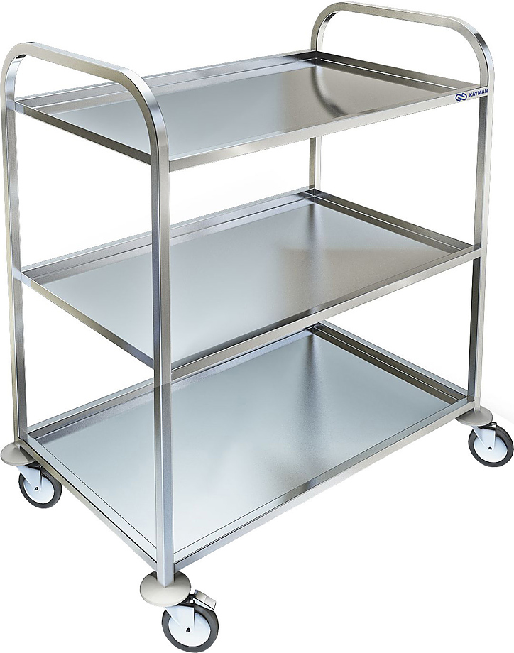 Сервировочная тележка KAYMAN ТС-11/3 используется на предприятиях общественного питания для доставки готовых блюд, сбора тарелок, чашек и стаканов со столов. Каркас выполнен из нержавеющей трубы AISI 304 20х20 мм толщиной 1,2 мм, полки - из нержавеющей стали AISI 304 толщиной 0,8 мм.