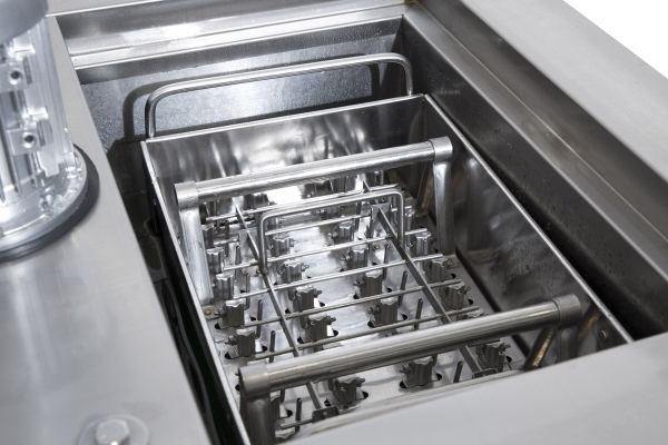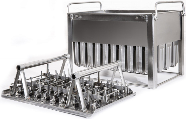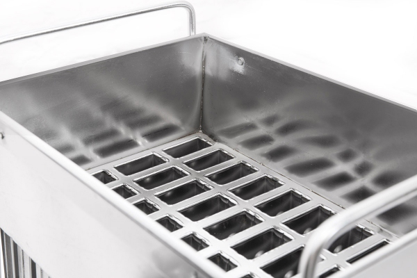 Корзина разделенная на 40 порций с дозированным соком или молоком опускается в ванну с пропилен гликолем, где при температуре -30 градусов Цельсия жидкость замерзает.