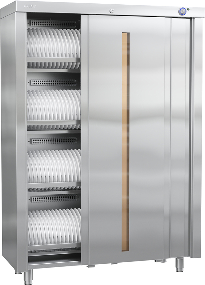Шкаф для стерилизации посуды ATESY ШЗДП-4-950-02-1 предназначается для обеззараживания столовой посуды, разделочных досок, крышек и других кухонных принадлежностей на предприятиях общественного питания, торговли и пищевых производствах. Модель оснащена дверцами со смотровыми окнами и таймером процесса стерилизации (до 120 мин). Материал корпуса и всех деталей - антикоррозионная сталь AISI 430 с полированной поверхностью.