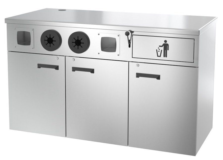 Корпус кофейной станции СУМАТРА КС-1500.700-01-Р выполнен из пищевой нержавеющей стали AISI 430. На лицевой панели расположены два диспенсера для стаканов, две ниши для хранения крышек и заслонка отделения для мусора, которая открывается рычагом. Внутренний обьем кофейной станции состоит из трех отделений с распашными дверями: отделение для двух бутылей (19 л) с водой, отделение с полкой и отделение для мусора с корзиной. Столешница изготовлена из искусственного камня. В столешнице предусмотрено отверстие для подвода коммуникаций размещенного на кофейной станции оборудования.