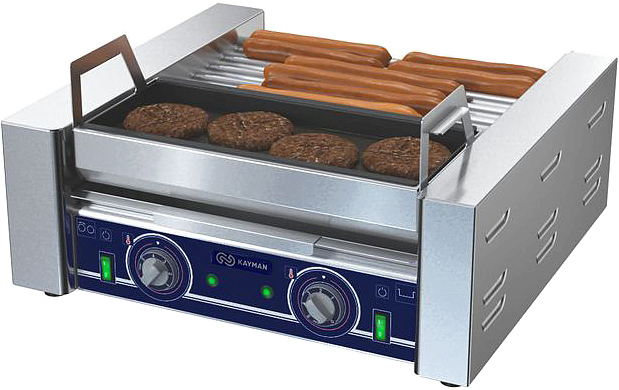 Гриль комбинированный KAYMAN КГЭ-7-УС А используется на предприятиях общественного питания, торговли и пищевых производствах для обжарки и поддержки в горячем состоянии сосисок и котлет. Модель оснащена двумя рабочими зонами и регуляторами температуры. Гриль обеспечивает равномерную температуру нагрева по всей длине жарочной поверхности. Материал поверхности - сталь.