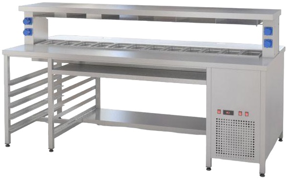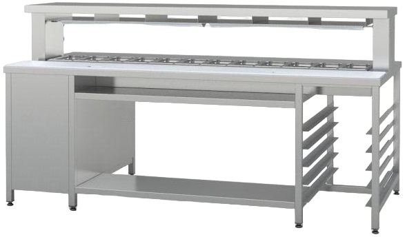 Станция RoboLabs СФО-240 используется на предприятиях общественного питания, торговли и пищевых для производствах с целью комплексного оснащения места для приготовления и продажи бургеров. Модель оснащена охлаждаемой ванной на 12 гастроемкостей, рабочей зоной, тепловой полкой, полкой и направляющими. Материал станции - высококачественная нержавеющая сталь.