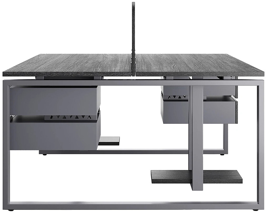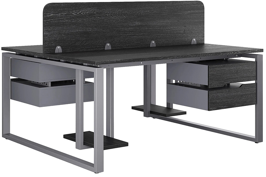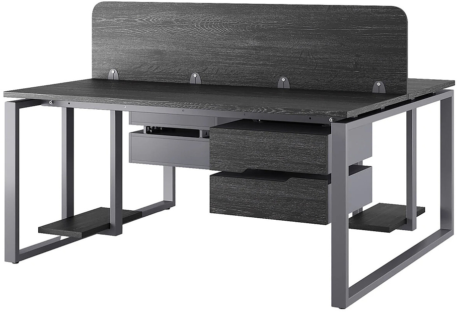 Офисный стол Кобор O1/2-80/120 graphite/woodl предназначен для двух рабочих мест и идеально подходит для офисов и кабинетов руководителей. Модель оснащена О-образными опорами. Материал столешницы - прочный ЛДСП толщиной 25 мм, усиленная снизу металлическим каркасом, материал опор и каркаса - окрашенный металл.