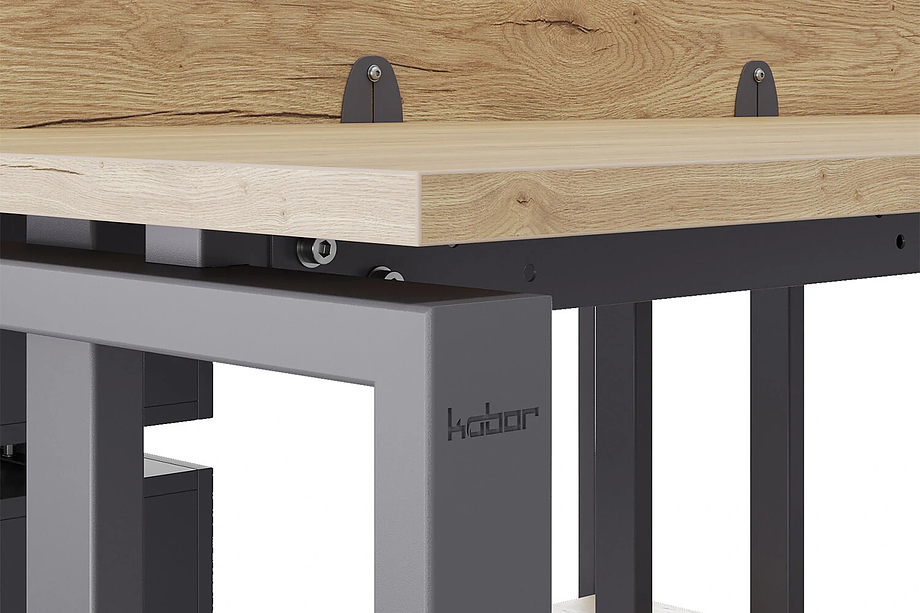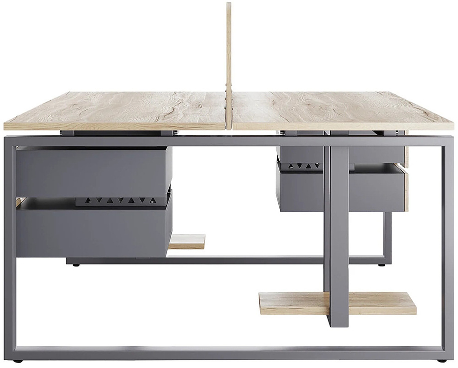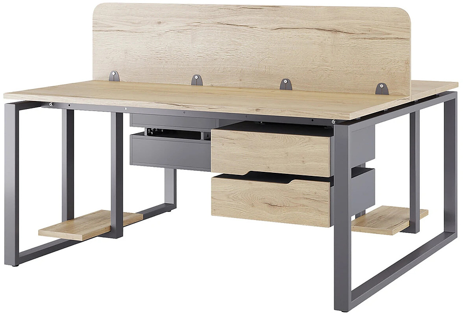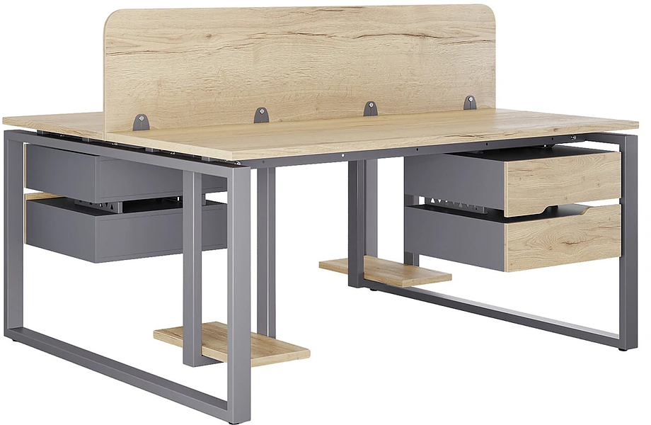 Офисный стол Кобор O1/2-140/140 graphite/naturall предназначен для двух рабочих мест и идеально подходит для офисов и кабинетов руководителей. Модель оснащена О-образными опорами. Материал столешницы - прочный ЛДСП толщиной 25 мм, усиленная снизу металлическим каркасом, материал опор и каркаса - окрашенный металл.