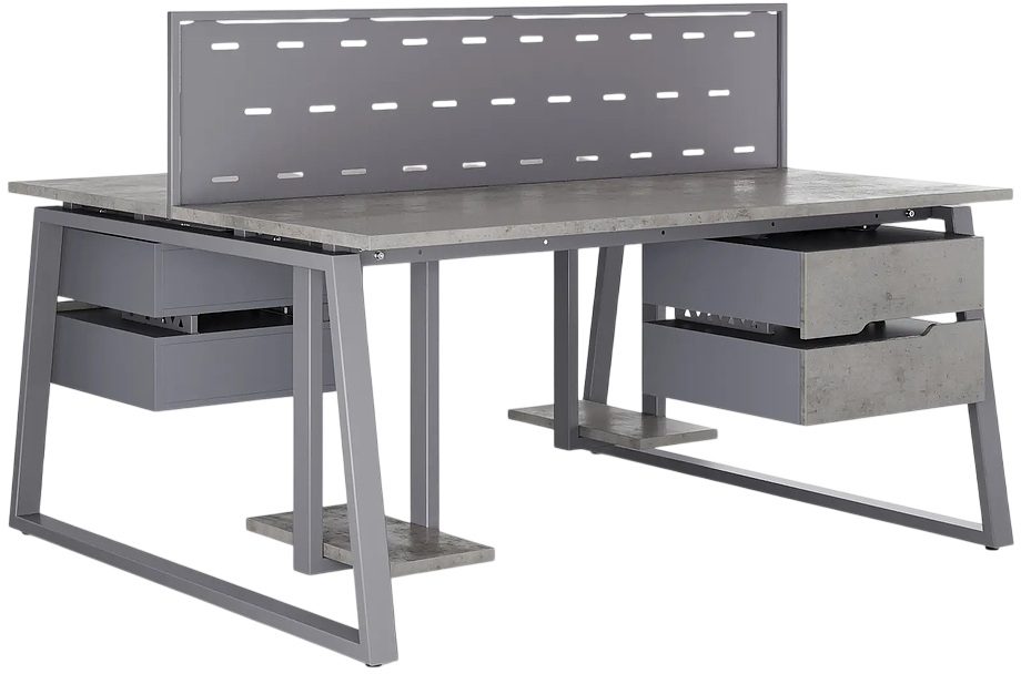 Офисный стол Кобор TR/2-140/140 graphite/chicago предназначен для двух рабочих мест и идеально подходит для офисов и кабинетов руководителей. Модель оснащена опорами в форме трапеции. Материал столешницы - прочный ЛДСП толщиной 25 мм, усиленная снизу металлическим каркасом, материал опор и каркаса - окрашенный металл.