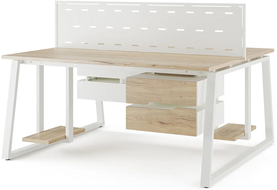 Офисный стол Кобор TR/2-80/120 white/natural предназначен для двух рабочих мест и идеально подходит для офисов и кабинетов руководителей. Модель оснащена опорами в форме трапеции. Материал столешницы - прочный ЛДСП толщиной 25 мм, усиленная снизу металлическим каркасом, материал опор и каркаса - окрашенный металл.