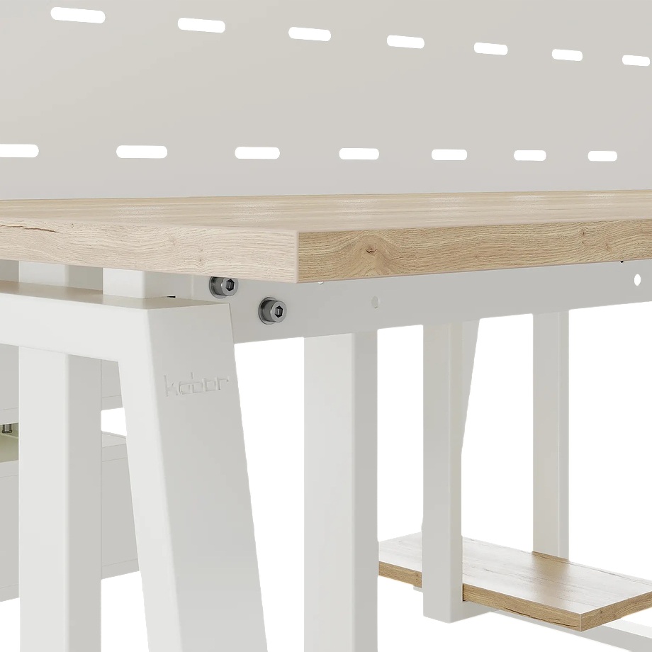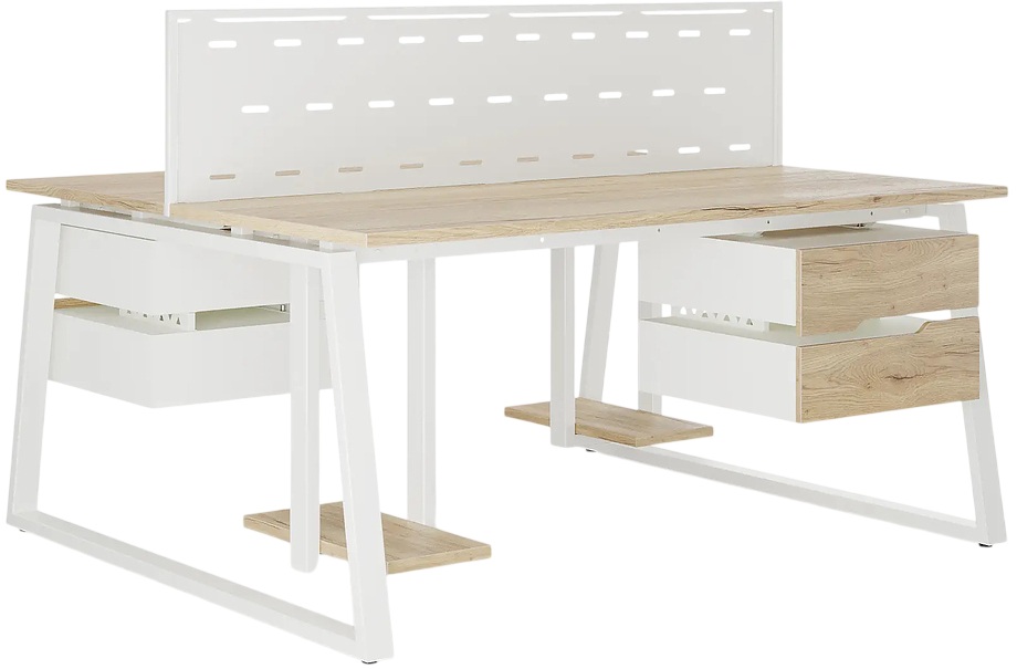Офисный стол Кобор TR/2-140/140 white/natural предназначен для двух рабочих мест и идеально подходит для офисов и кабинетов руководителей. Модель оснащена опорами в форме трапеции. Материал столешницы - прочный ЛДСП толщиной 25 мм, усиленная снизу металлическим каркасом, материал опор и каркаса - окрашенный металл.